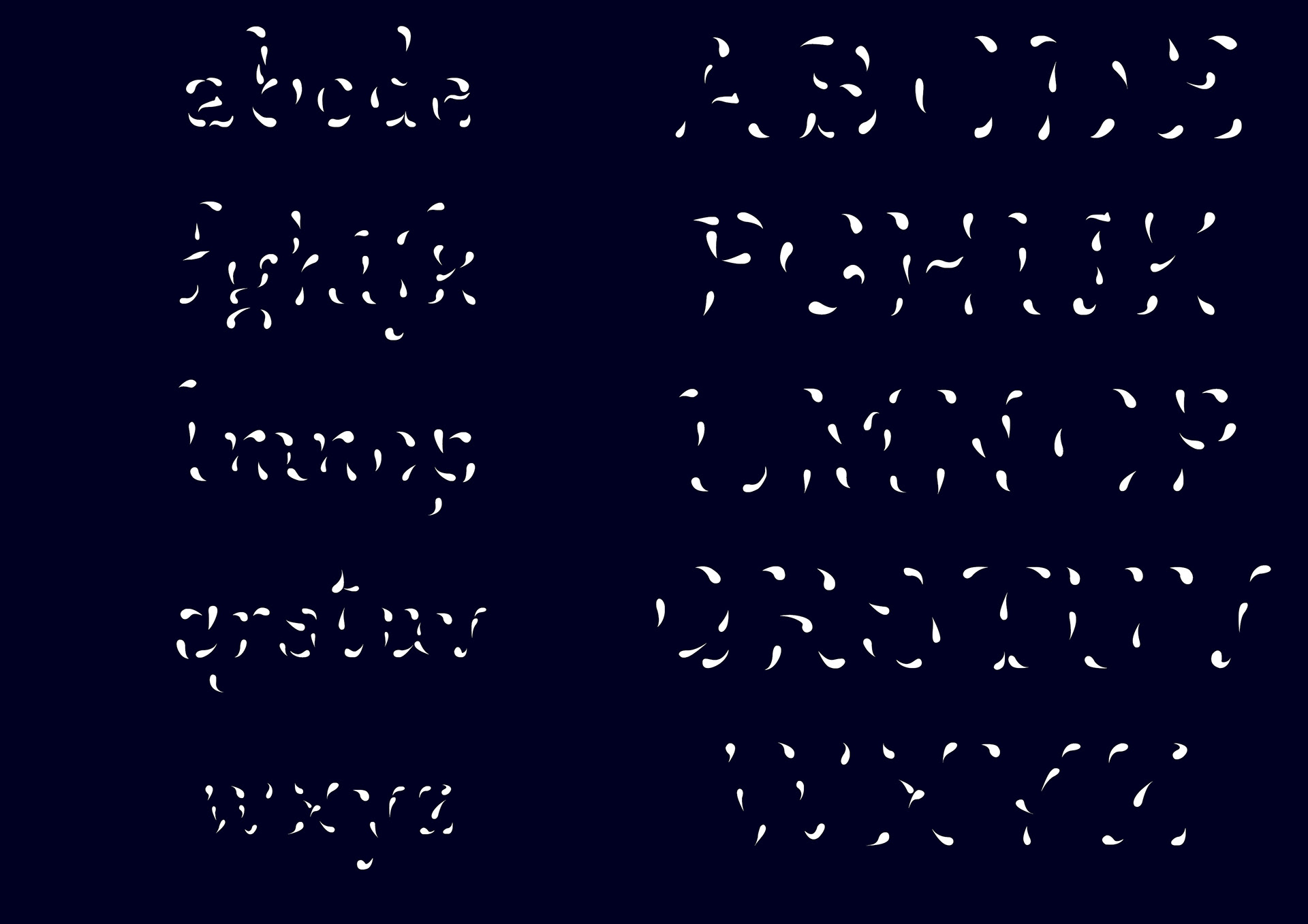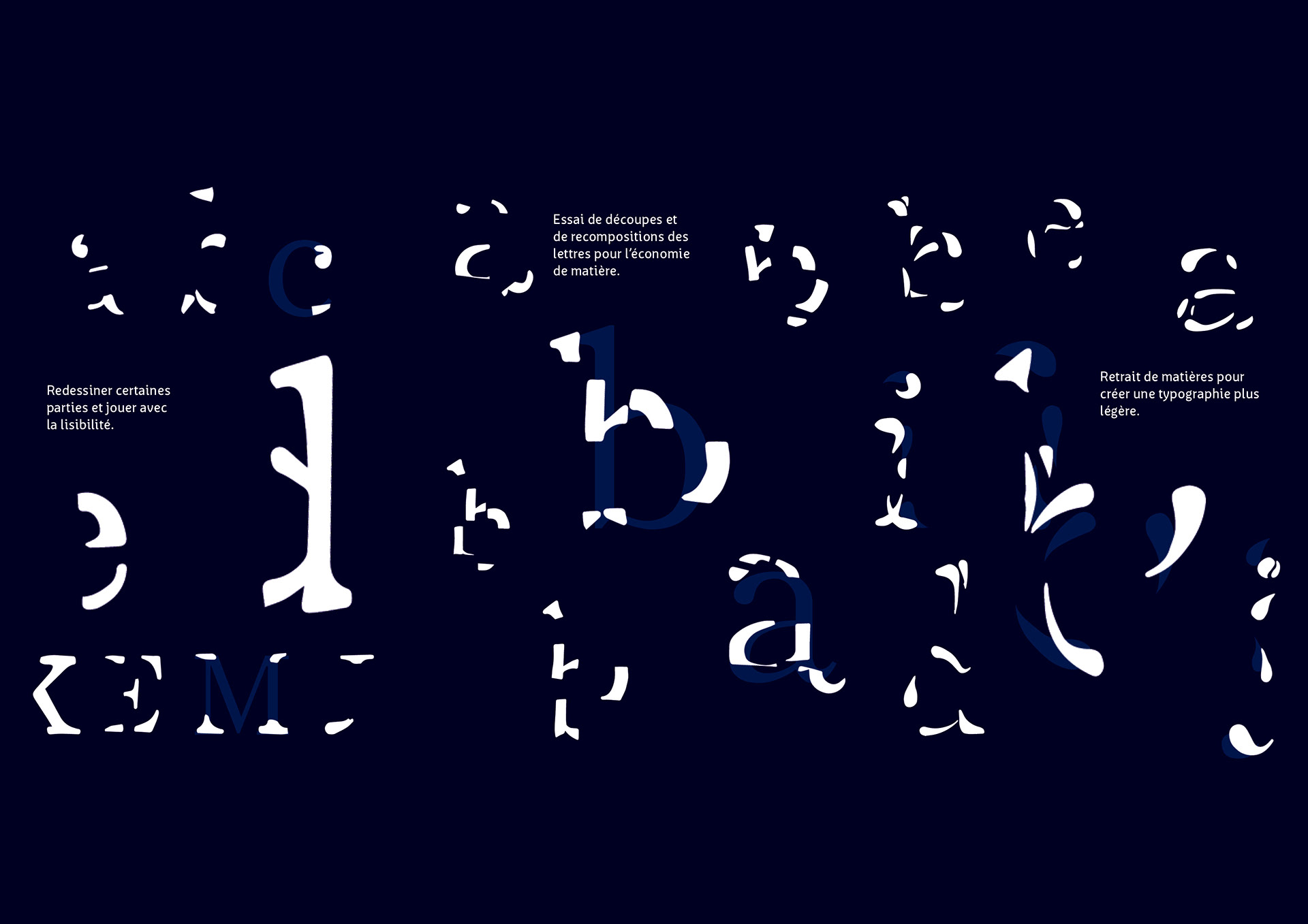 Cette typographie à été créée pour correspondre au thème «économie». J’ai travaillé le terme économie en retirant de la matière à une typographie déjà existante. Je voulais également jouer avec la lisibilité et donc pousser la lisibilité à son minimum. J’ai commencé par découper la lettre en de nombreux morceaux et en la reconstituant avec certains morceaux en moins. Malgré ça, la typographie était encore trop reconnaissable trop lisible et peu délicate.